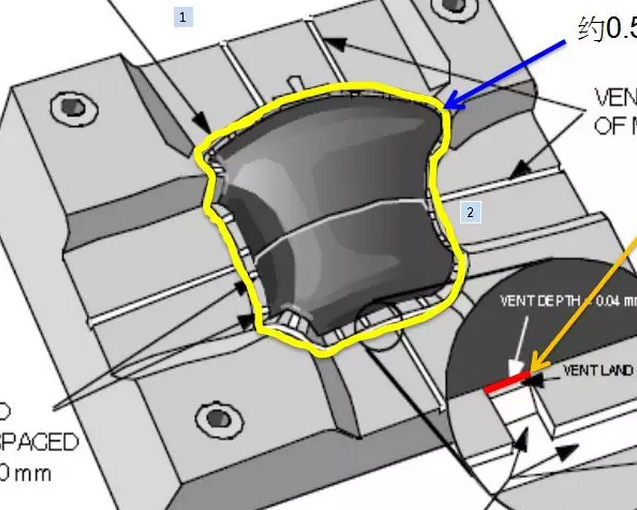 不良現(xiàn)象:如下右圖有注塑燒焦不良,注塑困氣導(dǎo)致; 解決對策:在分模面上加開排氣,位置如下圖