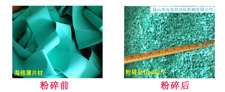 答:視泡棉的厚度而定,以厚度0.5mm的薄料為例,谷安粉碎機最小能粉碎至4mm以下。