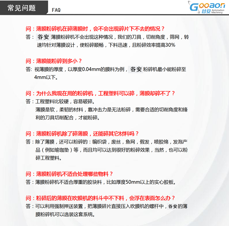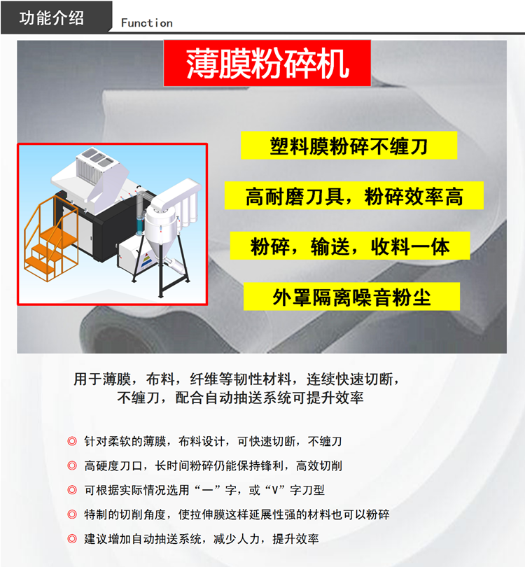 • 簡介:薄膜粉碎機  谷安片材粉碎機  谷安板材粉碎機適用于薄膜流延廠,或薄膜制品廠,如包裝袋,帶膜類紙制品,印刷品等。