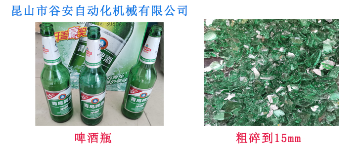 谷安啤酒瓶粉碎機系列可以粉碎各類玻璃瓶,如啤酒瓶,醬油瓶,各類白酒瓶等。