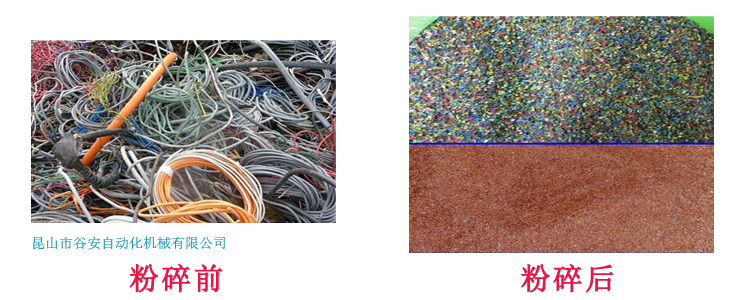 1.各類不同的大小線不需分揀,可同時投入本設備,經粉碎后均可自動分離出干凈的銅和塑料;
